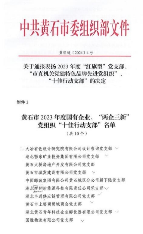 【喜報(bào)】喜訊!城發(fā)建工集團(tuán)城發(fā)建設(shè)公司黨支部獲評(píng)2023年度黃石市國有企業(yè) “十佳行動(dòng)支部”