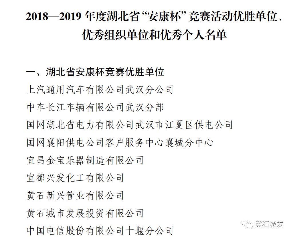 近日從湖北省總工會(huì)、湖北省應(yīng)急管理廳獲悉2018—2019年度湖北省“安康杯”競賽活動(dòng)結(jié)果揭曉黃石市城市發(fā)展投資集團(tuán)有限公司獲評(píng)“湖北省安康杯競賽優(yōu)勝位”
